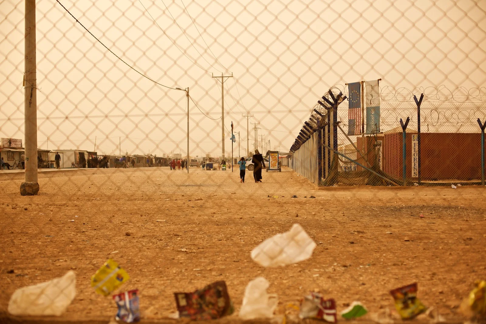 Obyvatelia mnohých táborov teda dennodenne bojujú s púštnymi či prašnými búrkami, ktoré bežne nasypú piesok do ich stanov, chatŕč či karavanov. Ochrániť vrecia s múkou a ryžou pred všadeprítomným pieskom je takmer nemožné: uvarené jedlo je teda často chrumkavejšie než by sa žiadalo. Cez deň tu vie byť 45°C, v noci ledva 10°C. Obuvou, ktorú si utečenci môžu dovoliť, sú často len papuče.